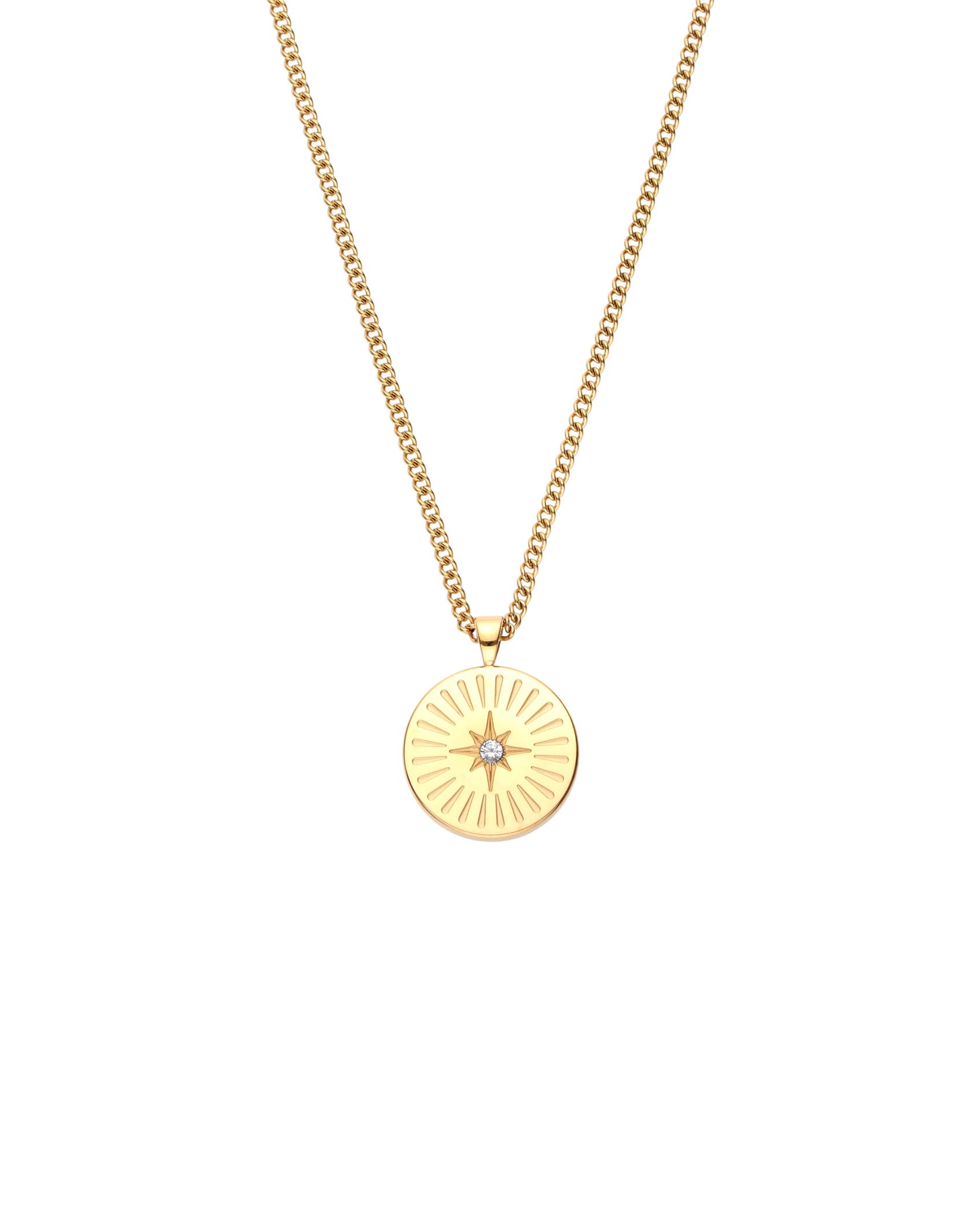 Made from stainless steel with an 18k PVD gold finish, it features a chunky round medallion engraved with fine radial lines and a star detail at the centre. A single stone sits neatly in the middle in crystal. The pendant hangs from a classic curb chain for a solid, balanced feel.