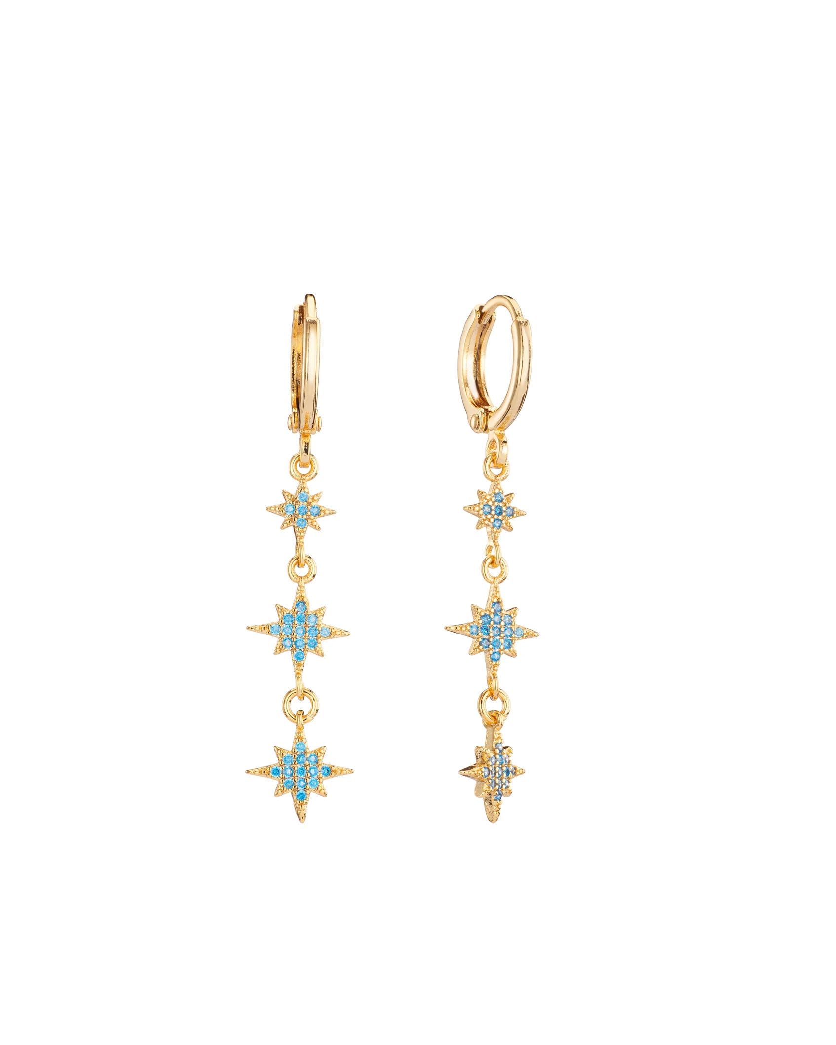 The Romilly Droplet Star Huggie Earrings are a standout style with a celestial twist. Each huggie features a drop of three star-shaped charms, detailed with tiny sparkling stones that shimmer with every movement.