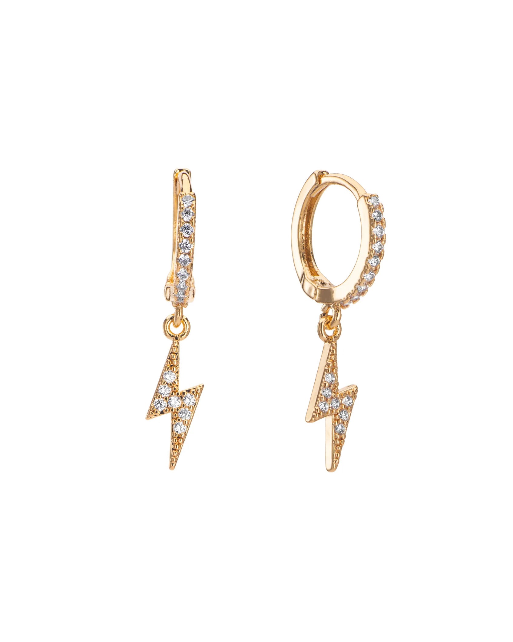 The Talitha Lightning Bolt Earrings from Bijoux de Mimi bring a spark to your everyday look. Each huggie is lined with small crystals and finished with a bold lightning bolt charm, detailed with matching stones for extra shine and edge.