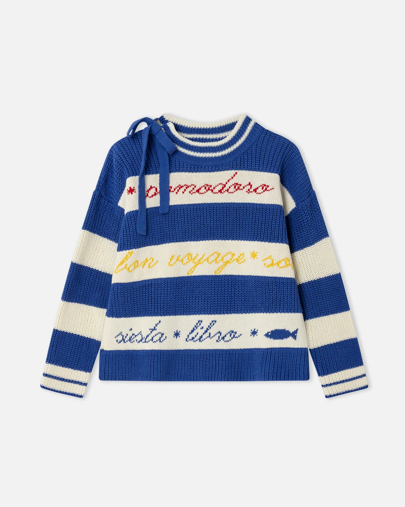 Wide stripes in a striking design, with words and symbols knitted into the cream section of the stripe. It has a tie detail at the neckline.