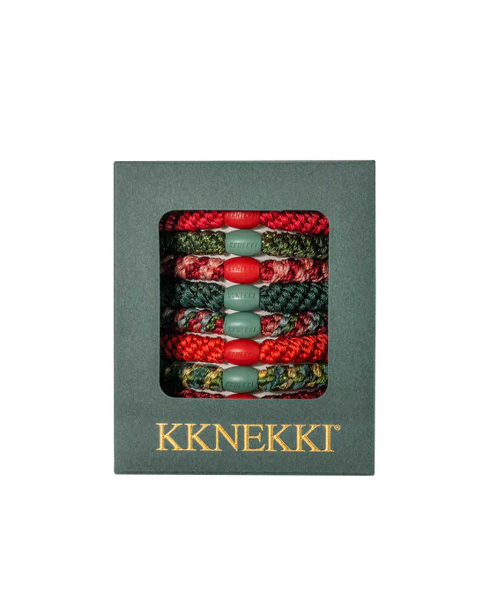 Each gift box comes with 8 chunky hairbands in festive colours of green, red, gold and dark pink.