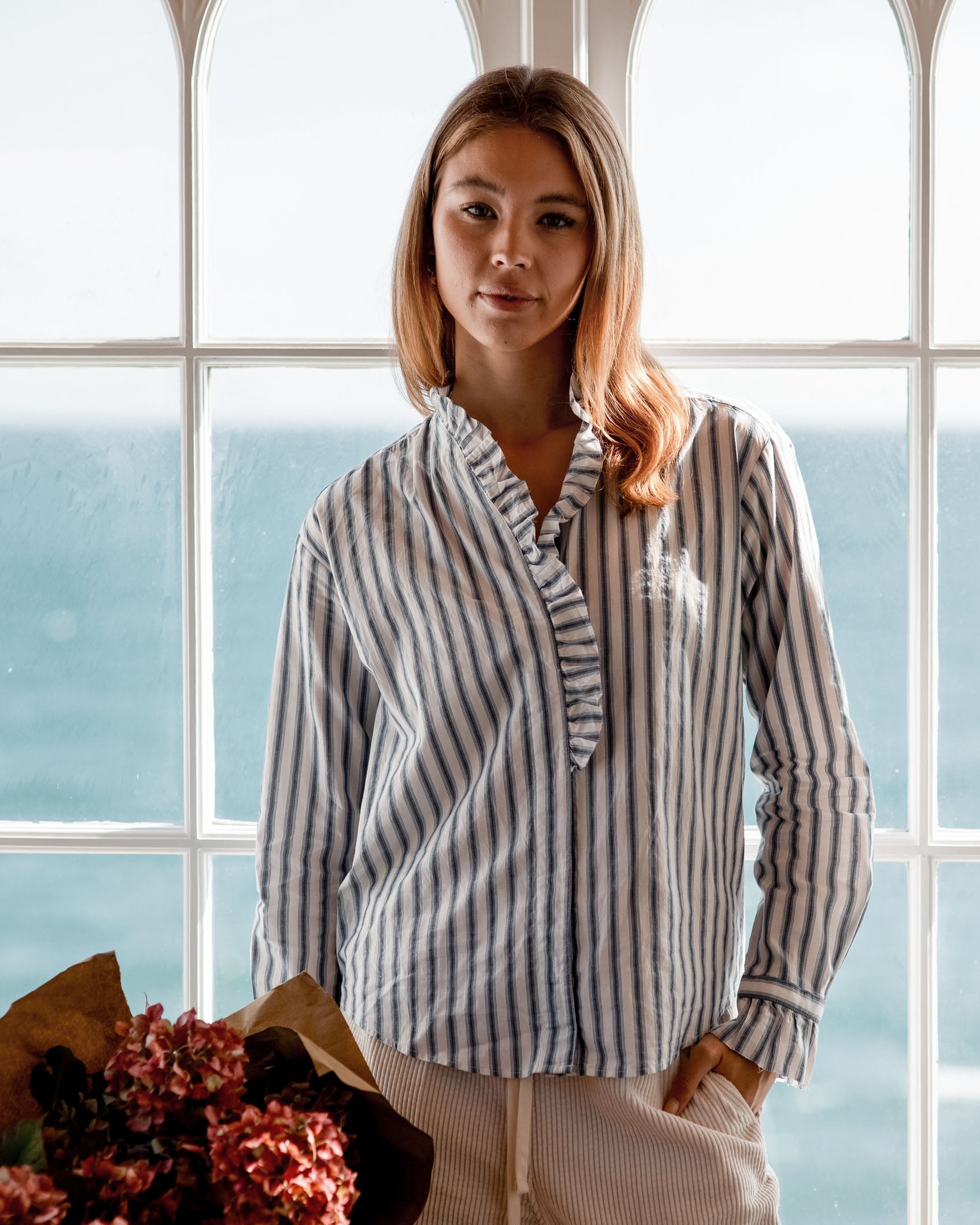 Made in a poplin cotton, the shirts has a ruffle details down the centre placket as will as on the cuffs. Delicate mother of pearl buttons are used throughout.