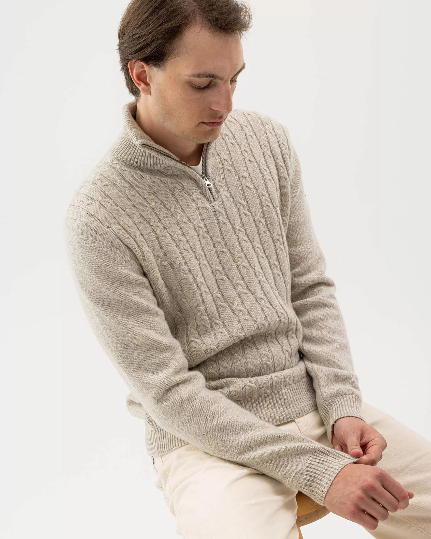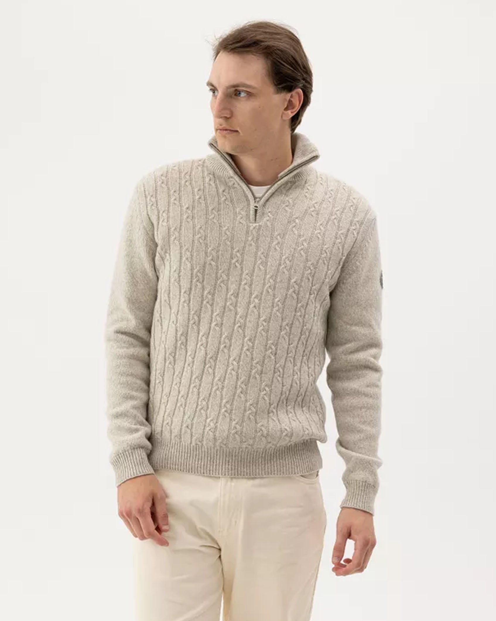 Made in a merino wool and cashmere yarn, the style has a cable-knit front, high ribbed collar with zipper.