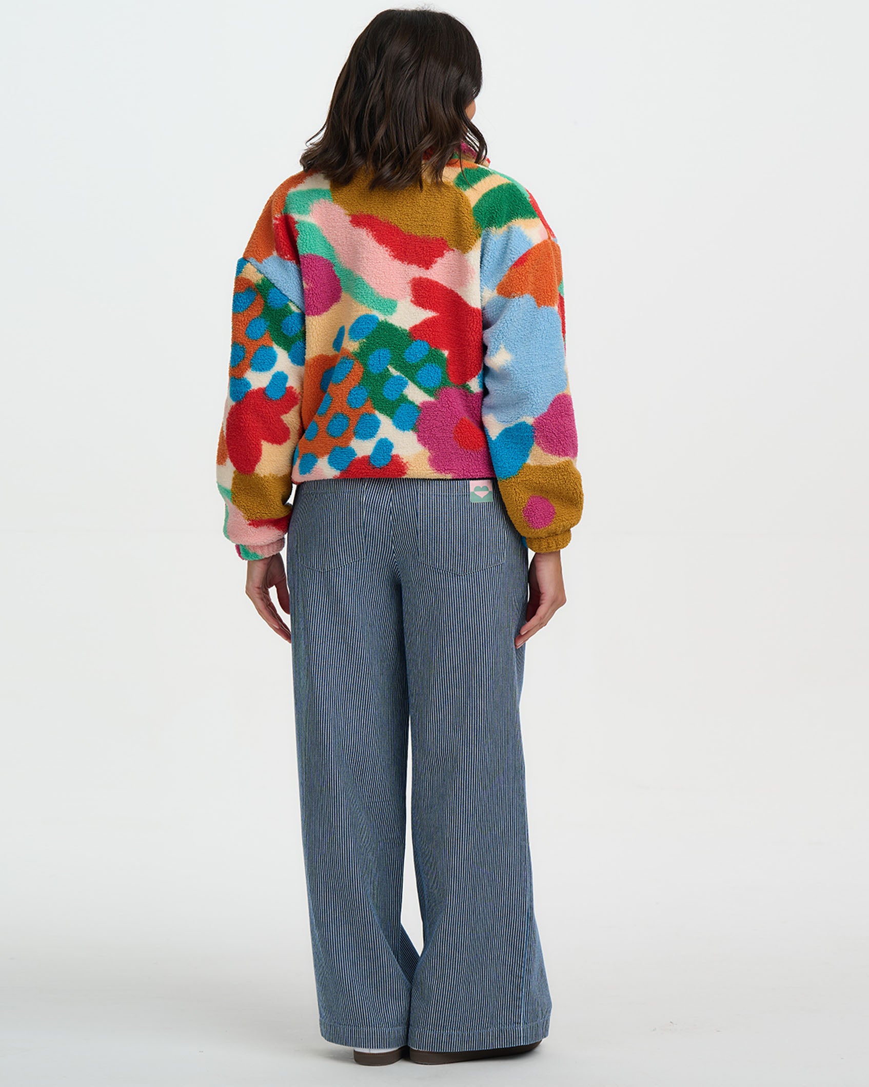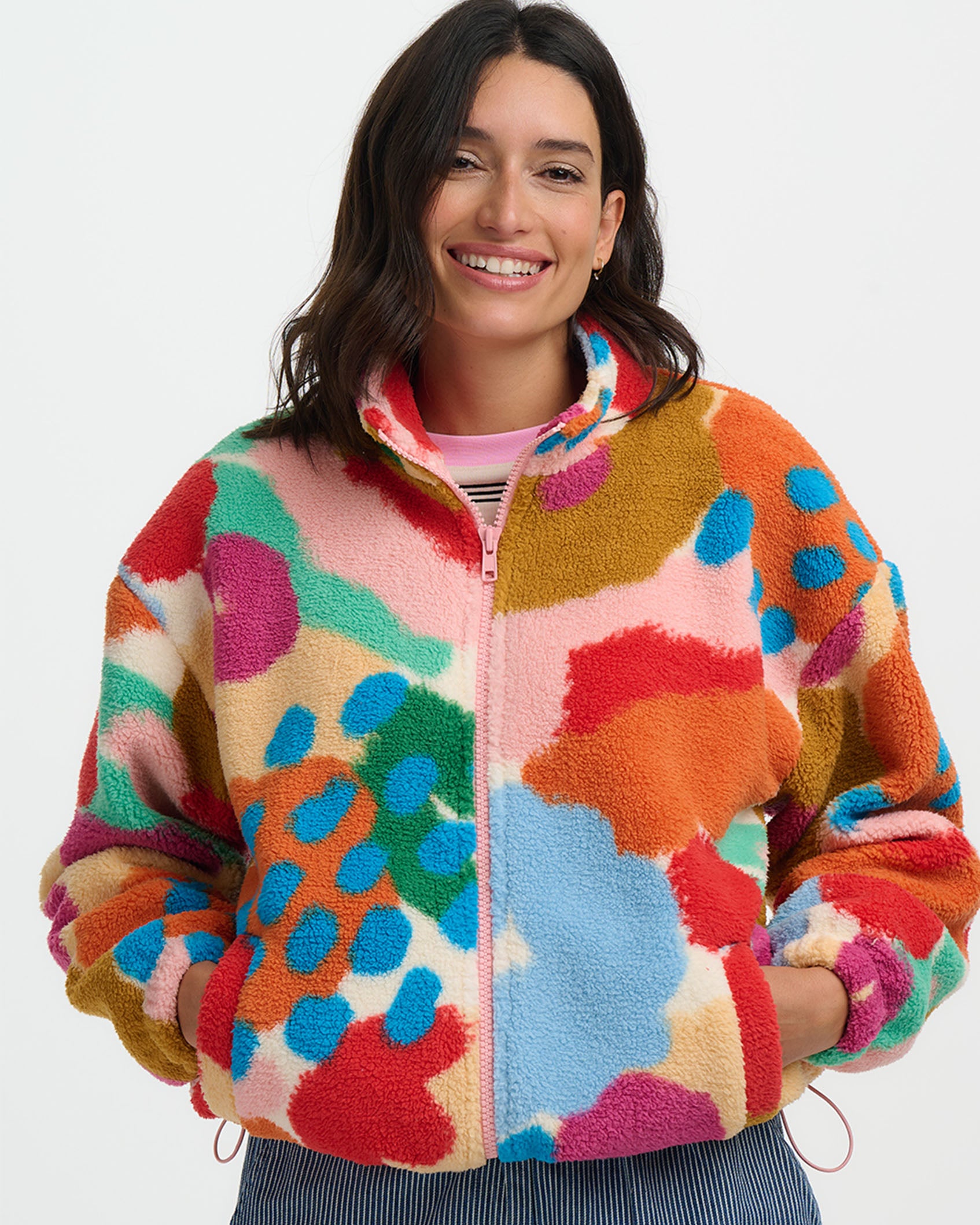 This cosy zip-up fleece is designed with a relaxed fit, making it the ultimate layering piece for cooler days. The design features colourful abstract brushstrokes and bold dotted accents that blend with a textured, painterly feel.