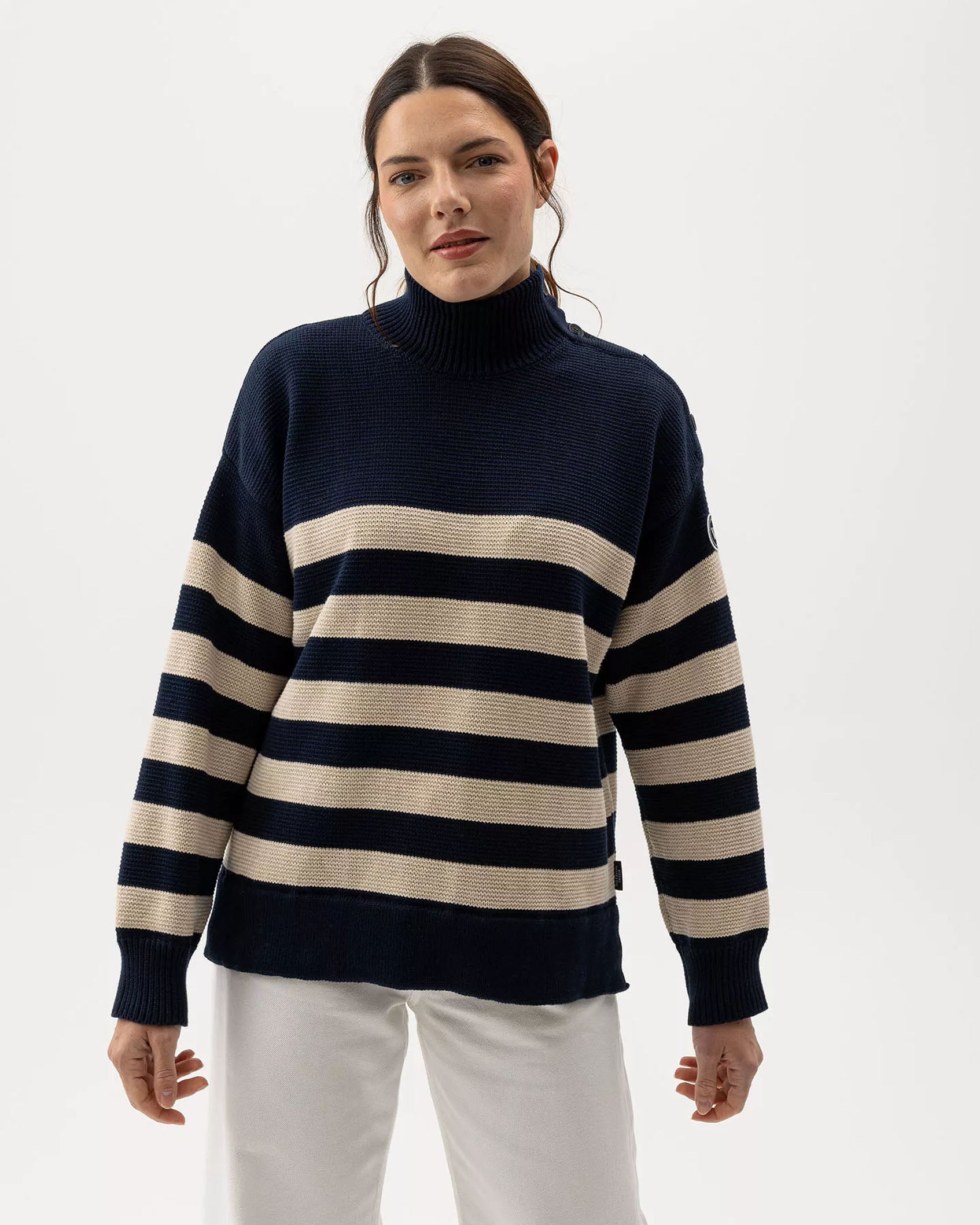 There is a collar with buttons to the side, giving this style a classic breton feel, which is completed with the striped design.