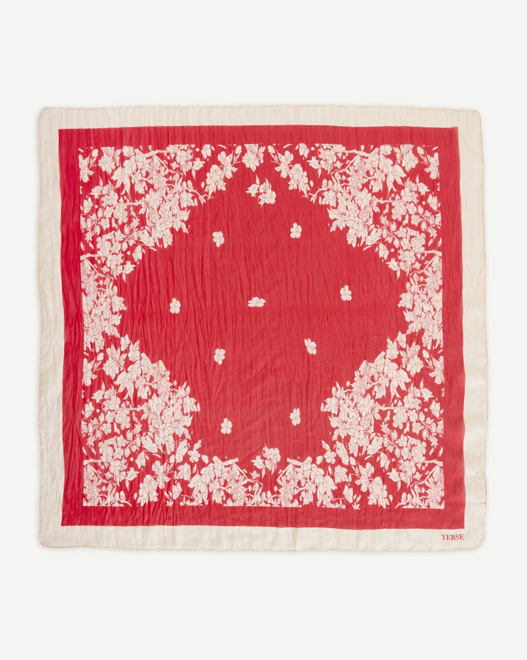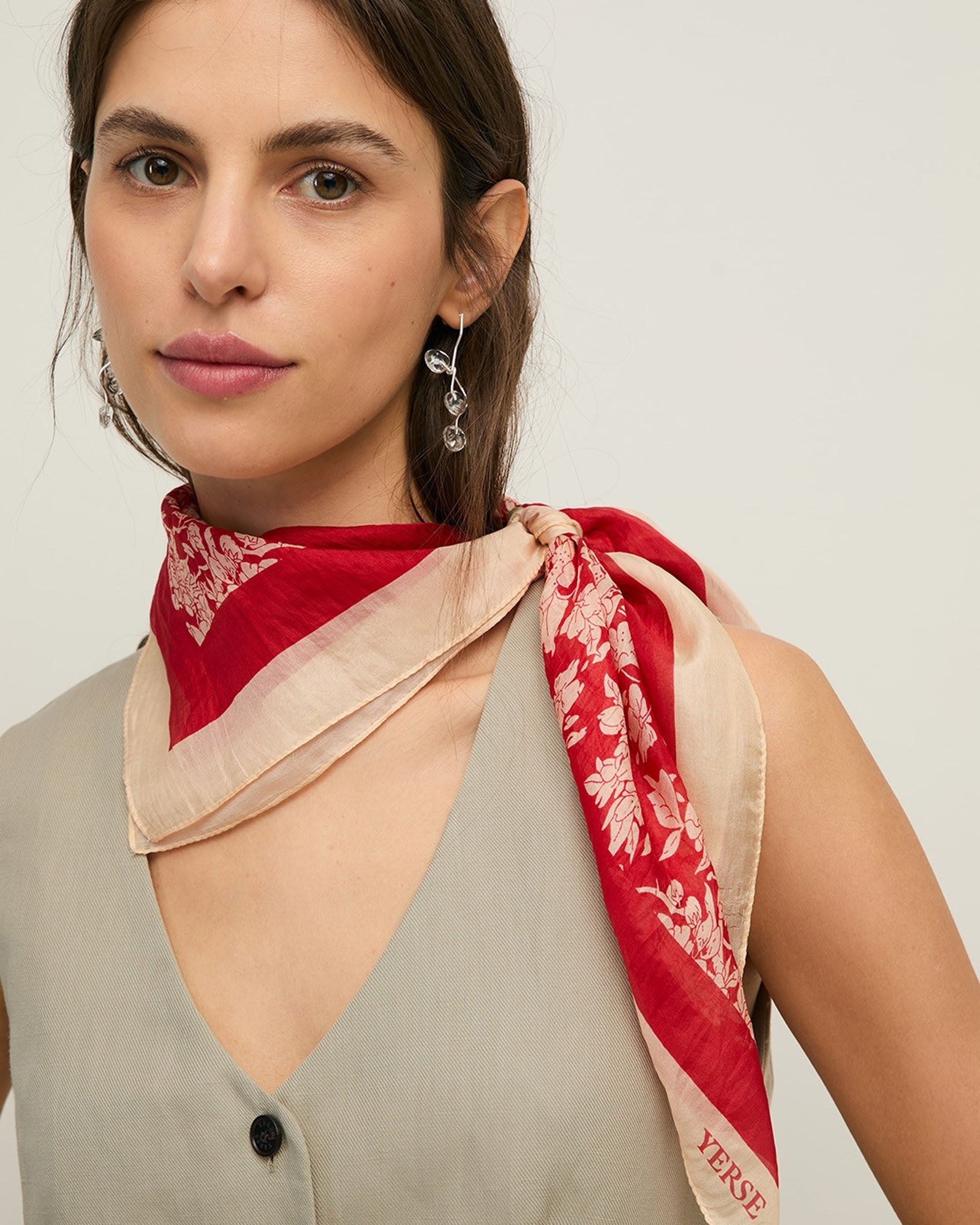 We love that a classic silk square is back on trend. An easy way to give your outfit a fresh lift for Spring. This 100% natural silk scarf has an elegant floral red print on an ecru background. In a soft, lightweight texture. 70 x 70cm.