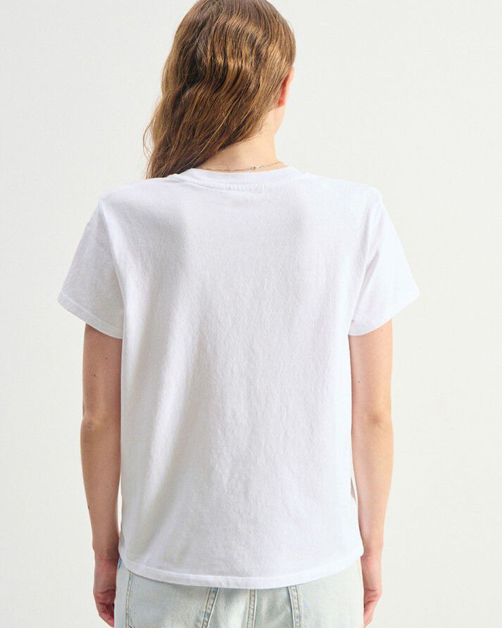 It's a classic straight cut with a short sleeve, an easy-to-wear basic that can be worn on its own or under a jacket.