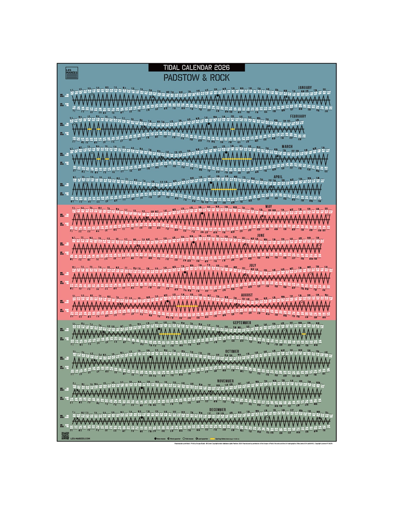 Commissioned from French company Les Marees, this has been based on information provided by the UKHO to provide the tide levels for each day in the Salcombe estuary and nearby coastline throughout the year, aswell as the lunar calendar sitting alongside it.
