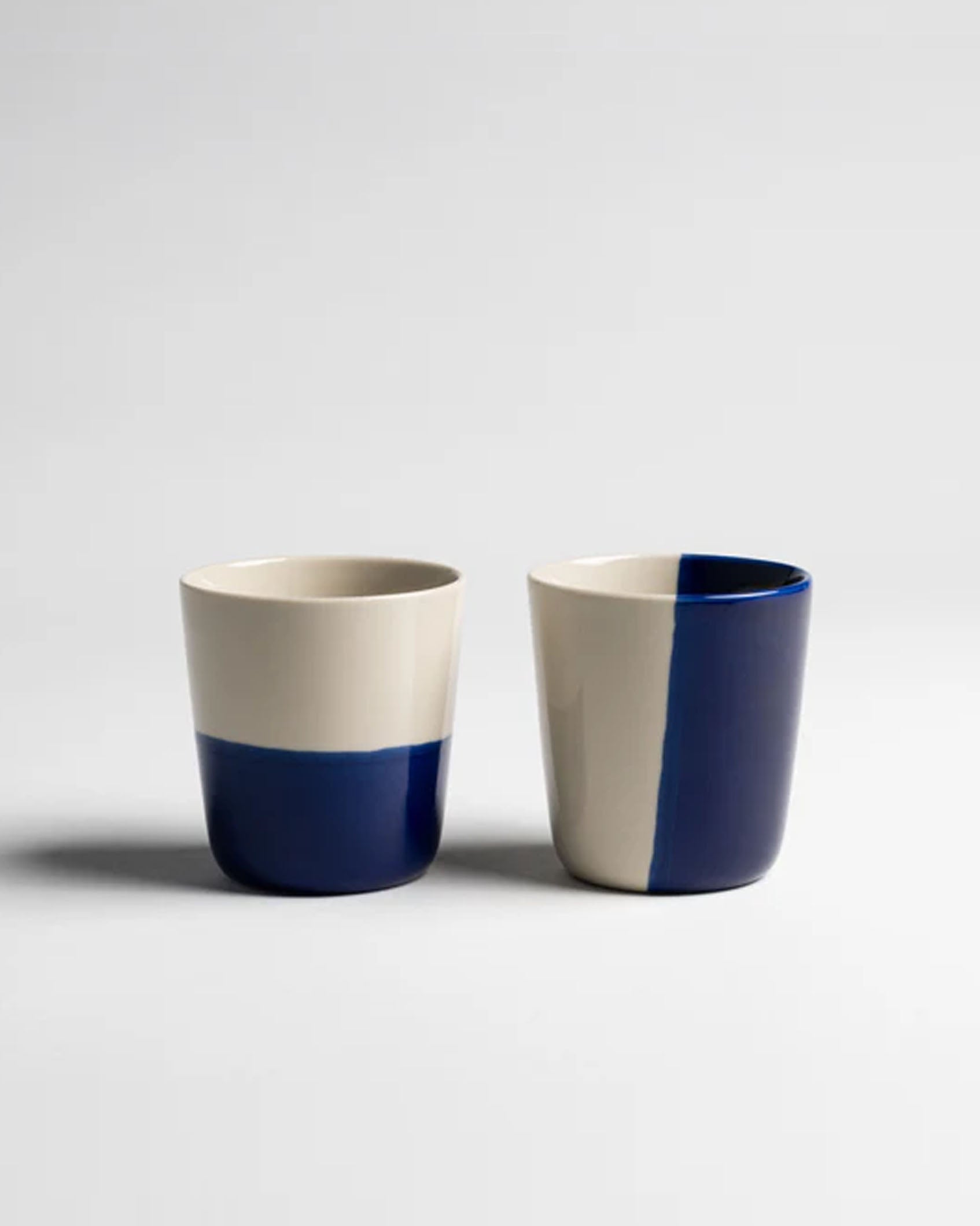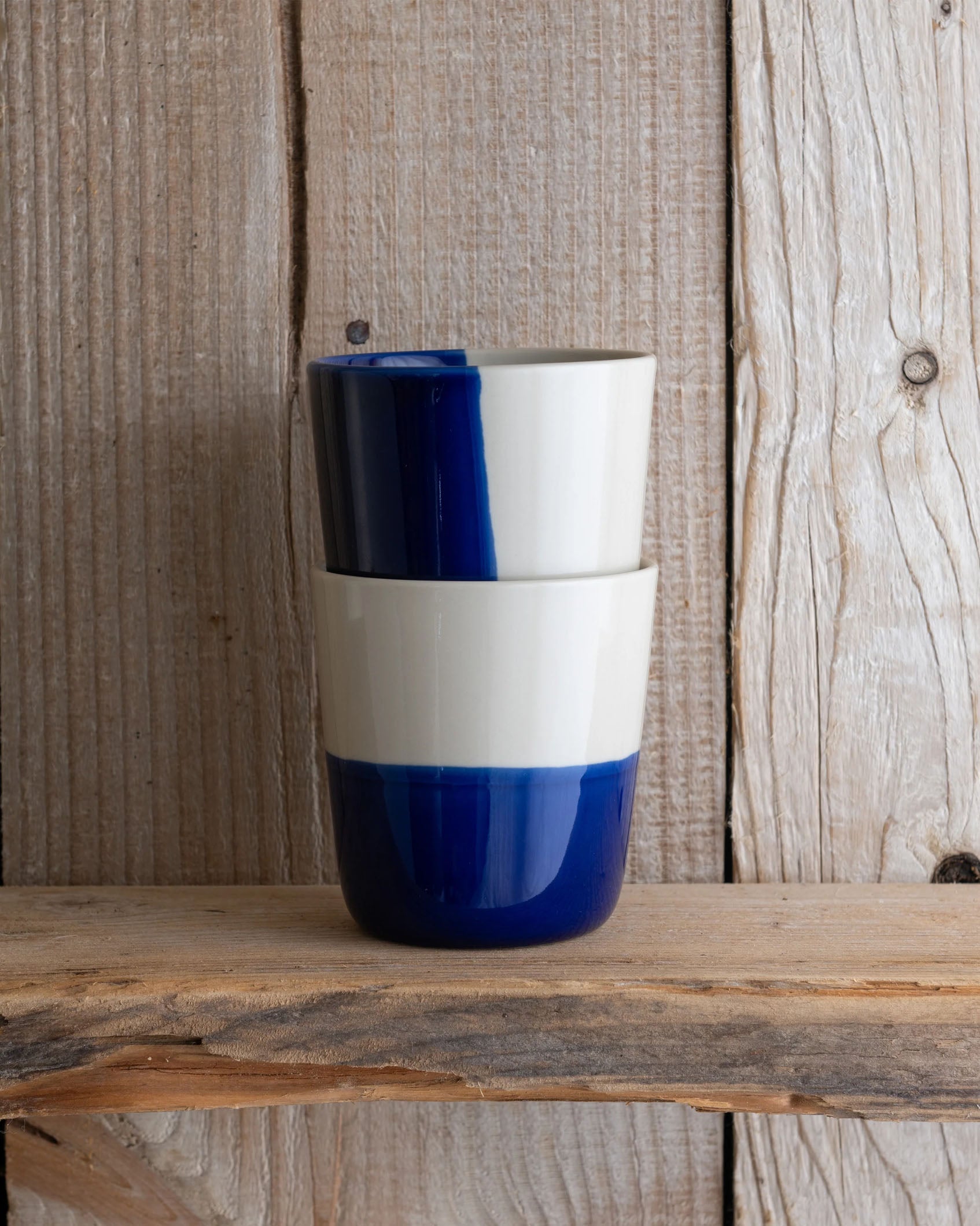 A pair of Rue beakers in white and dark blue. Individually hand-dipped in a smooth slip glaze, a traditional ceramic technique where the vessel is lowered by hand into liquid glaze, creating natural lines.