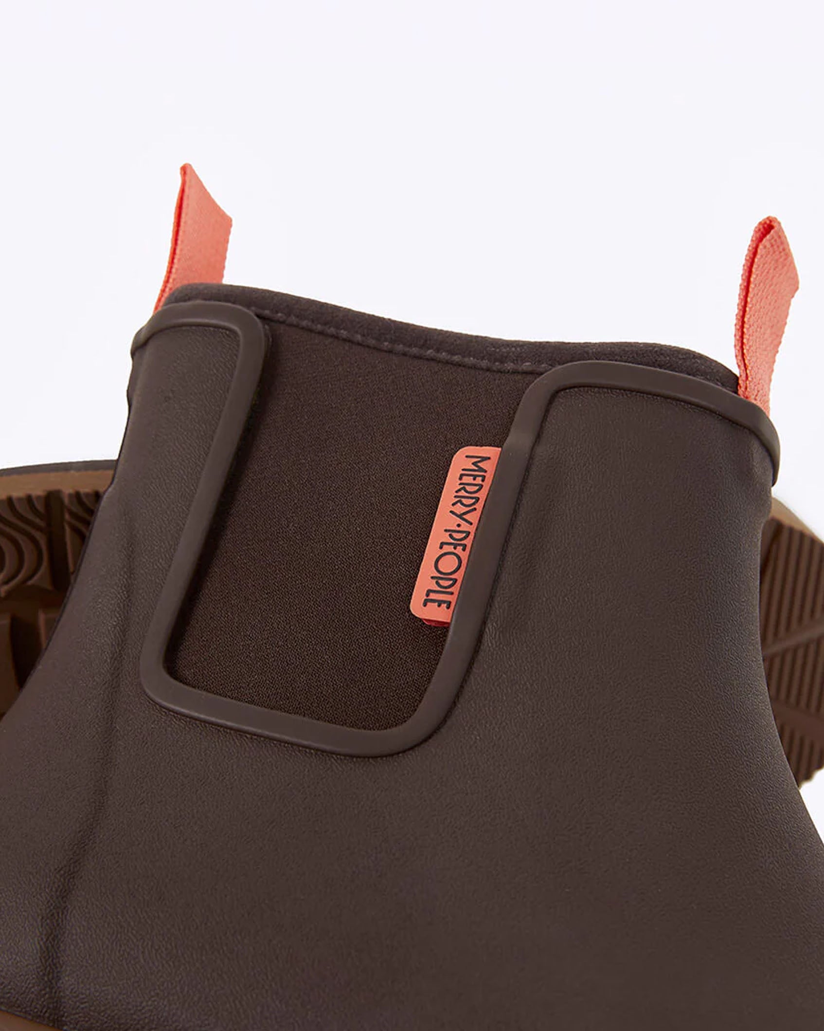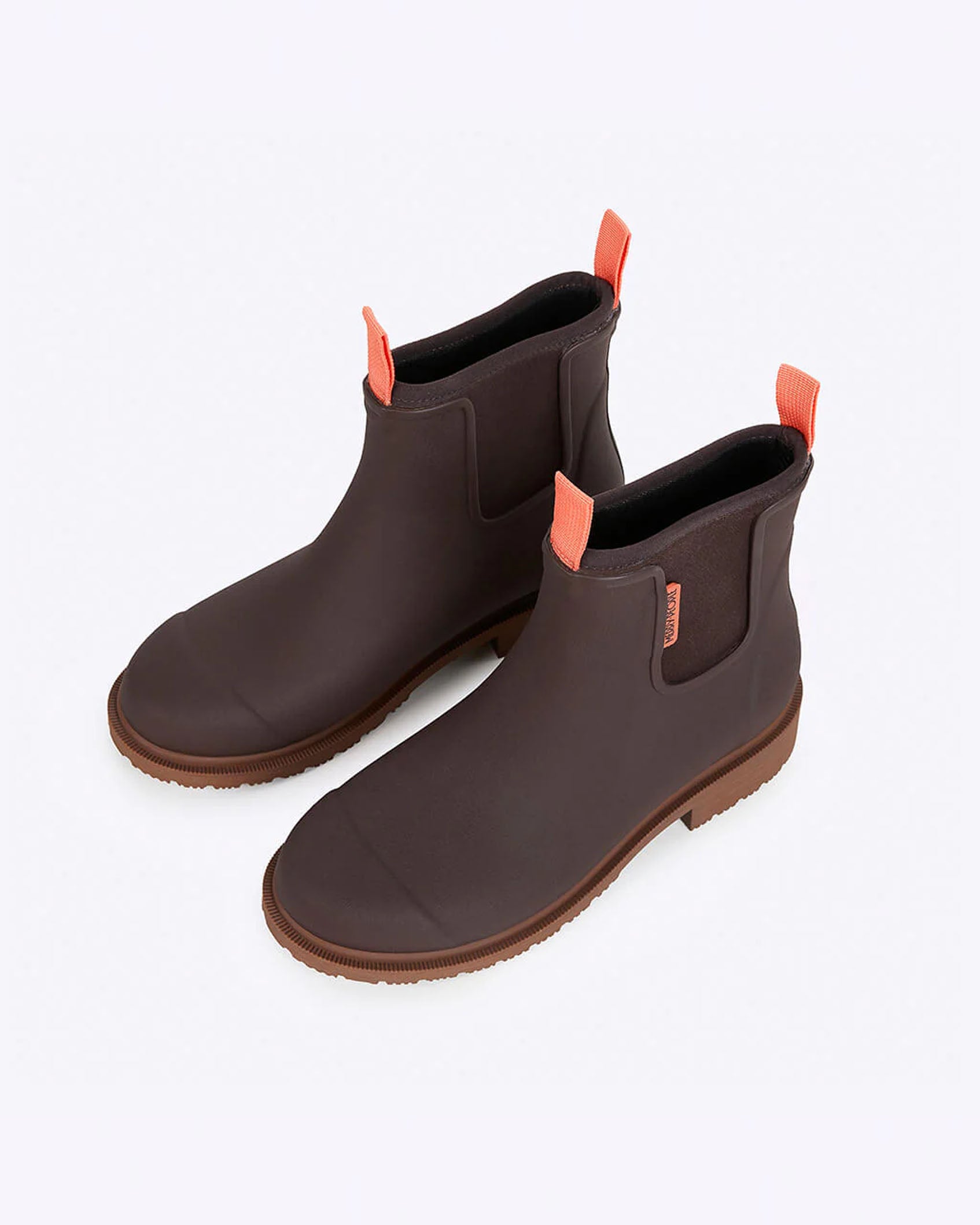 This pair is in the colour Mocha, a rich, chocolately brown with contrast orange tabs and logo. Natural colour heels and sole.